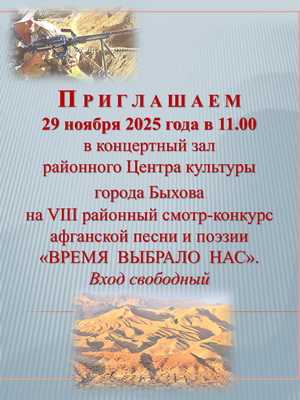 VIII районный смотр-конкурс афганской песни и поэзии «Время выбрало нас» состоится 29 ноября 2025 года в 11.00 в концертном зале районного Центра культуры города Быхова.