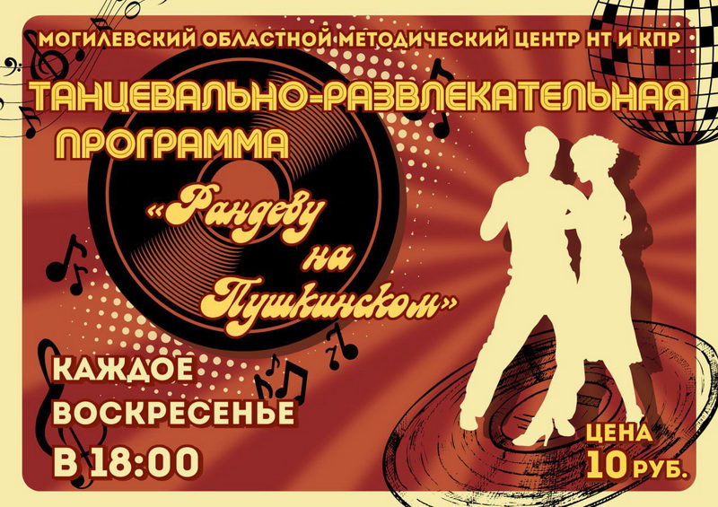 Приглашаем вас на танцевально-развлекательную программу «Рандеву на Пушкинском», которая проходит каждое воскресенье в 18.00 в Могилевском областном методическом центре НТ и КПР (бывшем Дворце культуры области) по адресу проспект Пушкинский, 7. Стоимость входа — 10 рублей!