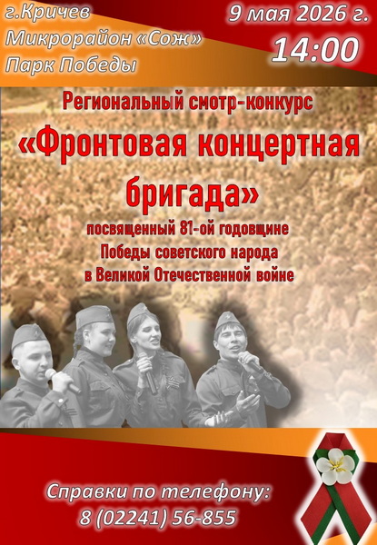 9 мая 2026 года в 14.00 в парке Победы г. Кричева состоится региональный смотр-конкурс «Фронтовая концертная бригада», посвященный 81-ой годовщине Победы советского народа в Великой Отечественной войне.