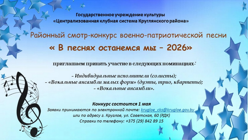 Подать заявки необходимо до 17 апреля, отправив на электронную почту: krugloe_cks@krugloe.gov.by конкурсные материалы с пометкой «смотр конкурс «В песнях остаемся мы – 2026».