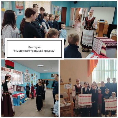 У пятніцу Наталля Рыгораўна прапанавала наведвальнікам выстаўку сваіх тканых работ “Мы доўжым традыцыі продкаў”, дзе прадстаўлены яе тканыя дарожкі і ручнікі, а потым запрасіла на майстар-клас “У традыцыях продкаў”.